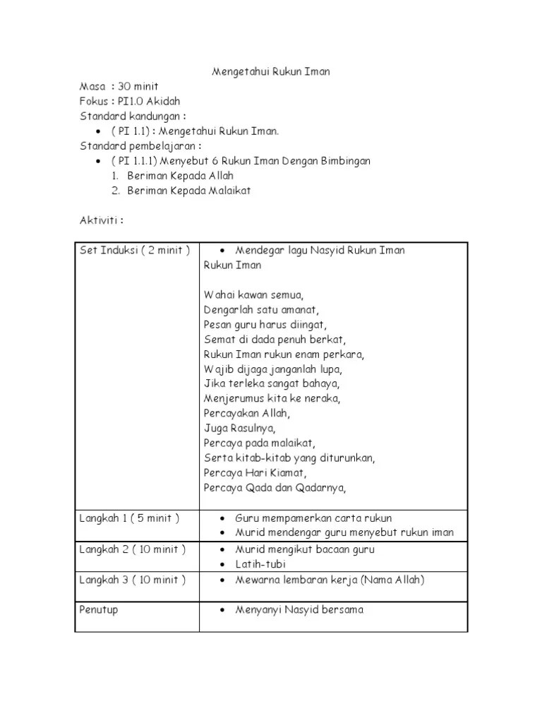 Menyebut 3 daripada 6 rukun iman dengan betul selepas aktiviti nyanyian lagu rukun iman. Rancangan pengajaran (rph) prasekolah suku kata.